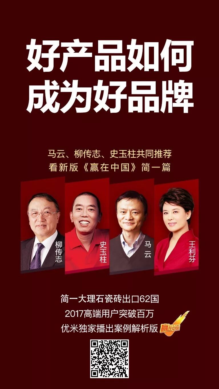10月24日,柳传志、马云、史玉柱共同力荐,王利芬率队精心打造中国首部企业转型实战纪录大片“《赢在中国·简一大理石瓷砖商业纪录片》首映礼”于广州举行,同期纪录片在优米网独家上线。