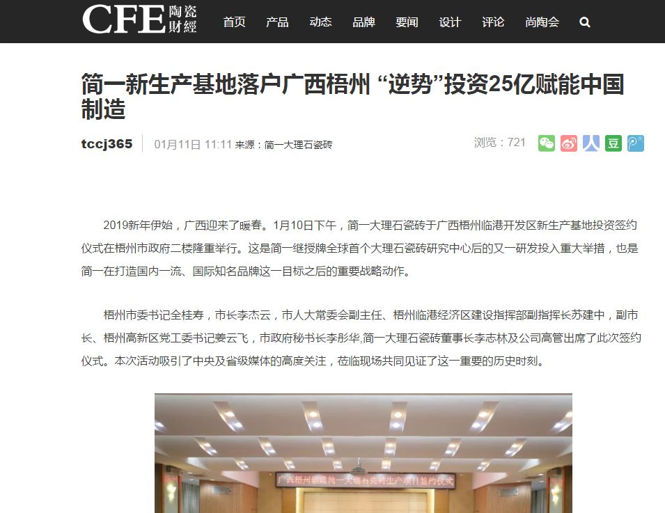 此次简一增投梧州新生产基地正是响应国家号召,符合国家“科学、创新、协调、绿色、共享”新发展理念。未来,简一将继续肩负中国陶瓷复兴的使命,致力打造一张最美的中国陶瓷品牌名片,让简一成为社会尊重、消费者认同,行业尊敬的国内一流、国际知名企业。