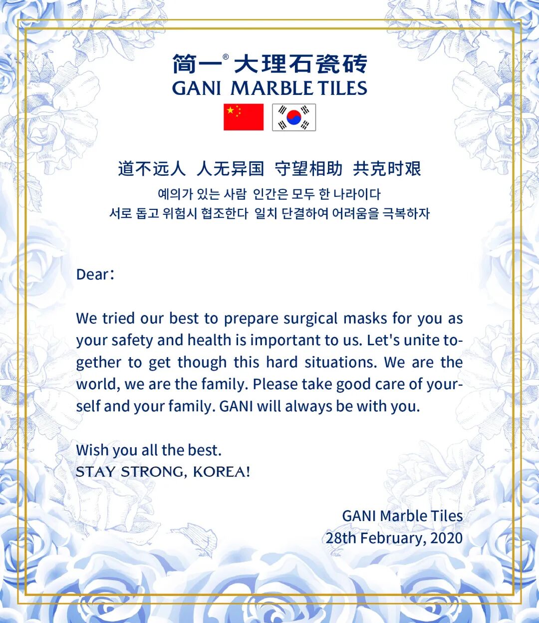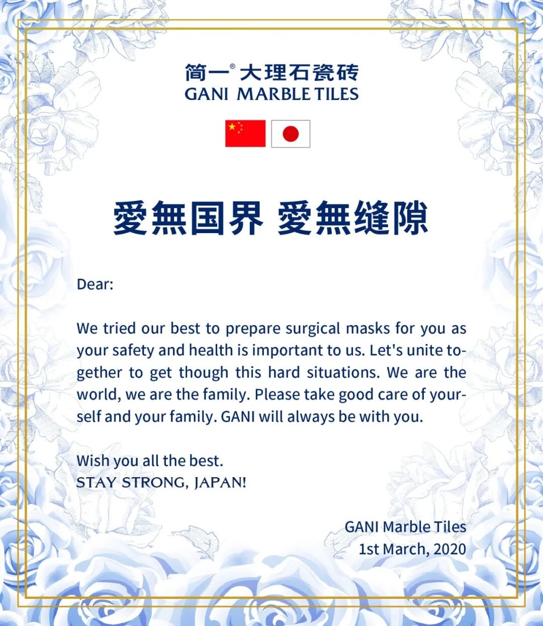 Far distance cannot separate us, and we all live in a united world. GANI group has always been concerned about the safety and health of the global family during this difficult times, and will do its best to support them to fight the desease and provide love and help.