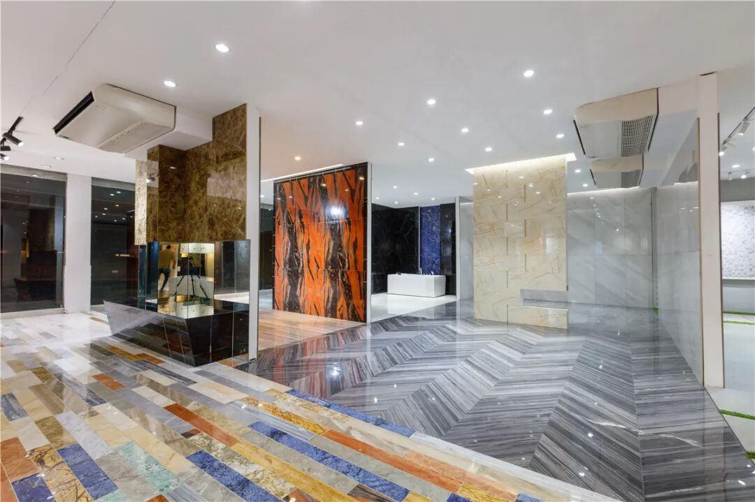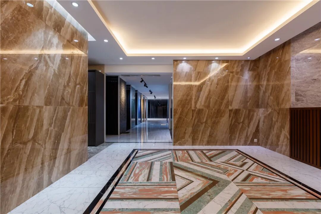 在孟加拉展厅中,简一所倡导的价值导向通过简洁前卫的设计完美诠释。覆盖九大色系的行业最全花式纹理,世界领先的大理石瓷砖技术及高性能应用,富有设计感的特色水刀拼花墙,在明亮的光带及周遭强烈的反射下营造出一种现代化、国际化、科技感的氛围,突显大理石之美及其纯洁。