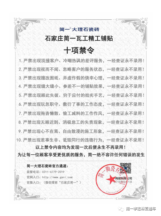另外一个则是密缝铺贴瓦工队伍,瓦工师傅的手艺直接决定了设计效果能否100%得到落地还原。为此,石家庄简一在当地的瓦工师傅中,挑选经验丰富、手艺精湛的师傅签约组成简一专用瓦工团队,定期培训简一密缝铺贴工艺,考核合格颁发相应证书。通过不断学习,做到会看图识图并主动思考优化方案。同时,石家庄简一对其进行标准化管理,颁布“十大禁令”,包括严禁擅改图纸、偷工减料、消极怠工、背后诋毁竞争对手、顶撞客户等,一经查证永不录用。