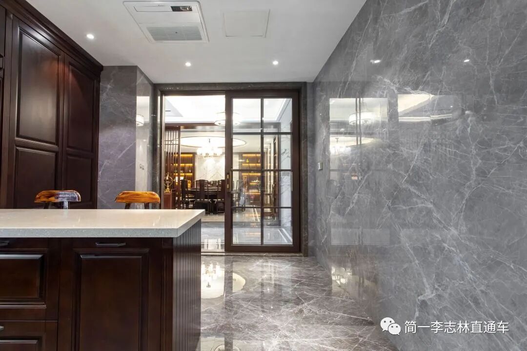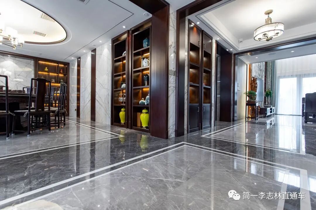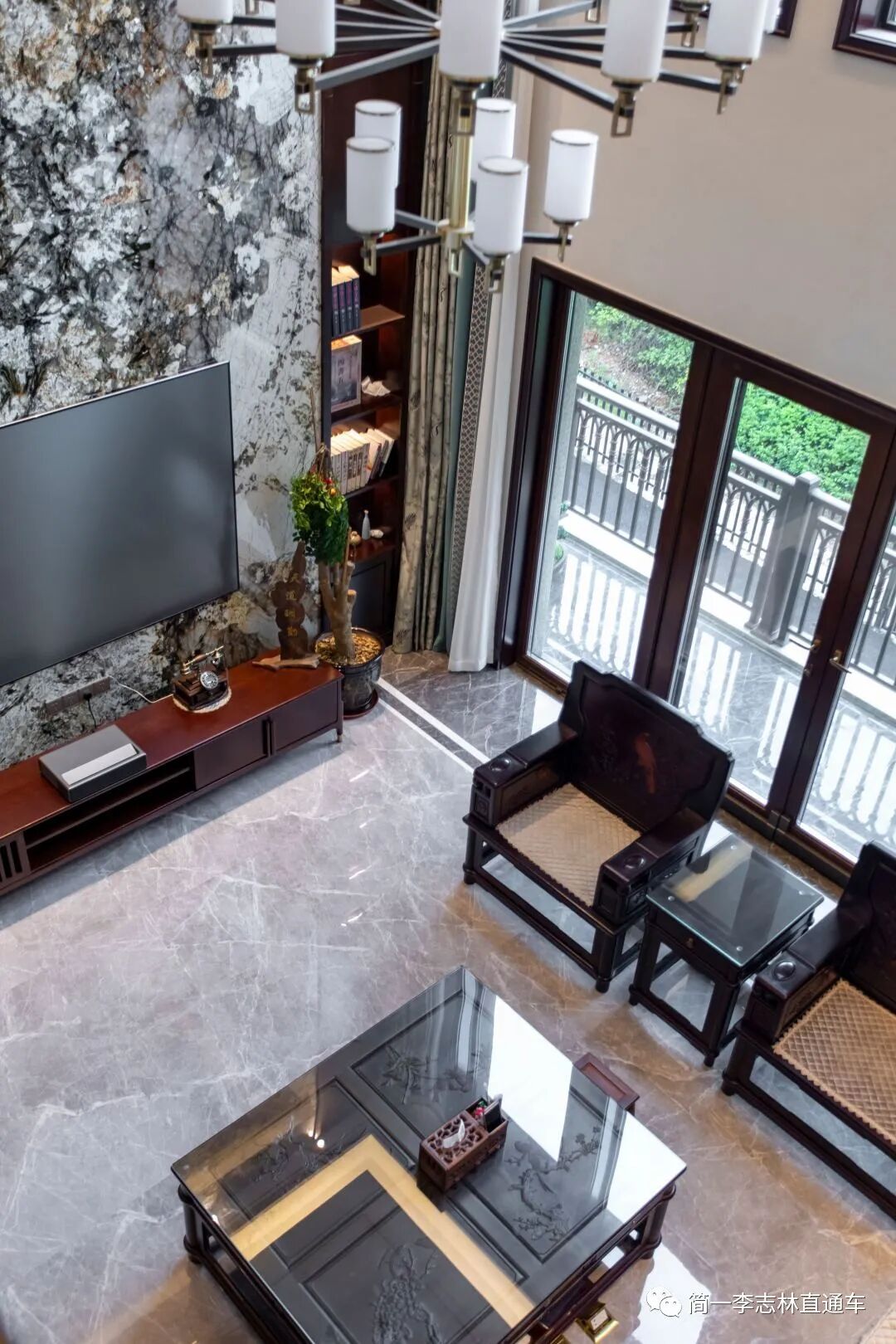 接着,我们步入客厅二层挑空的结构更显开阔,客厅地面选用阿波罗银进行密缝铺贴,浅灰色凸显了空间的层次和主题,同时减轻了中式风格的厚重,连纹密缝赋予空间整体美和流畅感,整体更加简洁,也会让空间看起来更大